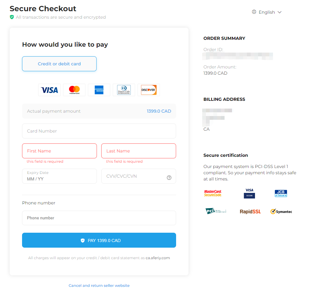 Currently, aferiy.com supports 2 payment methods: Paypal, Credit/Debit Card. The detailed processes are as follows: